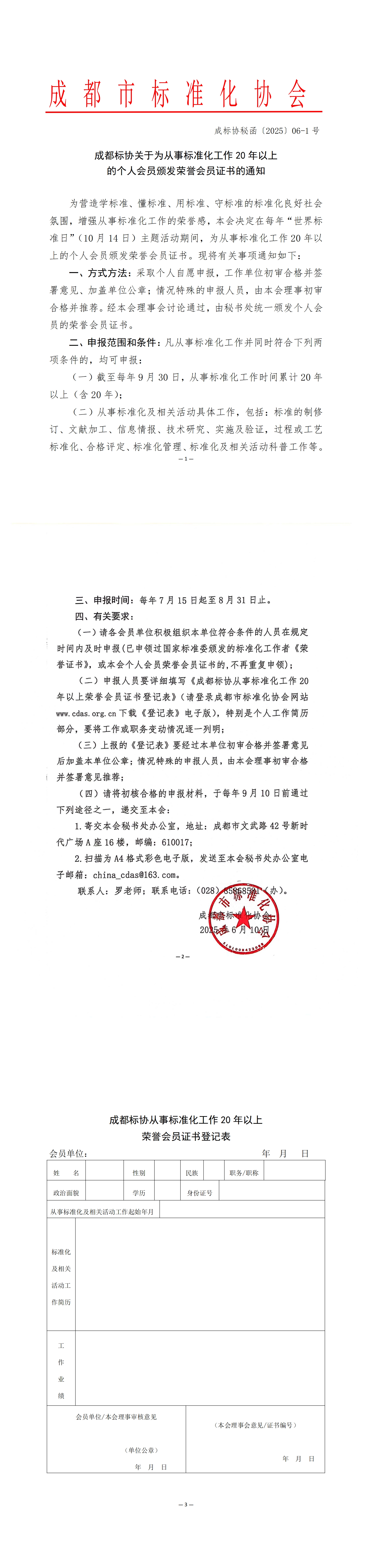 成都标协关于为从事标准化工作 20 年以上 的个人会员颁发荣誉会员证书的通知